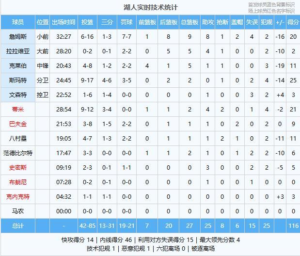 斯玛特25分2板、蒂米21分2板4助2断、詹姆斯20分9板8助2帽、克莱伯11分5板1助、八村塁11分1板1助2断、巴夫金9分1板1助2帽、范德比尔特6分2板1助、史密斯5分3助